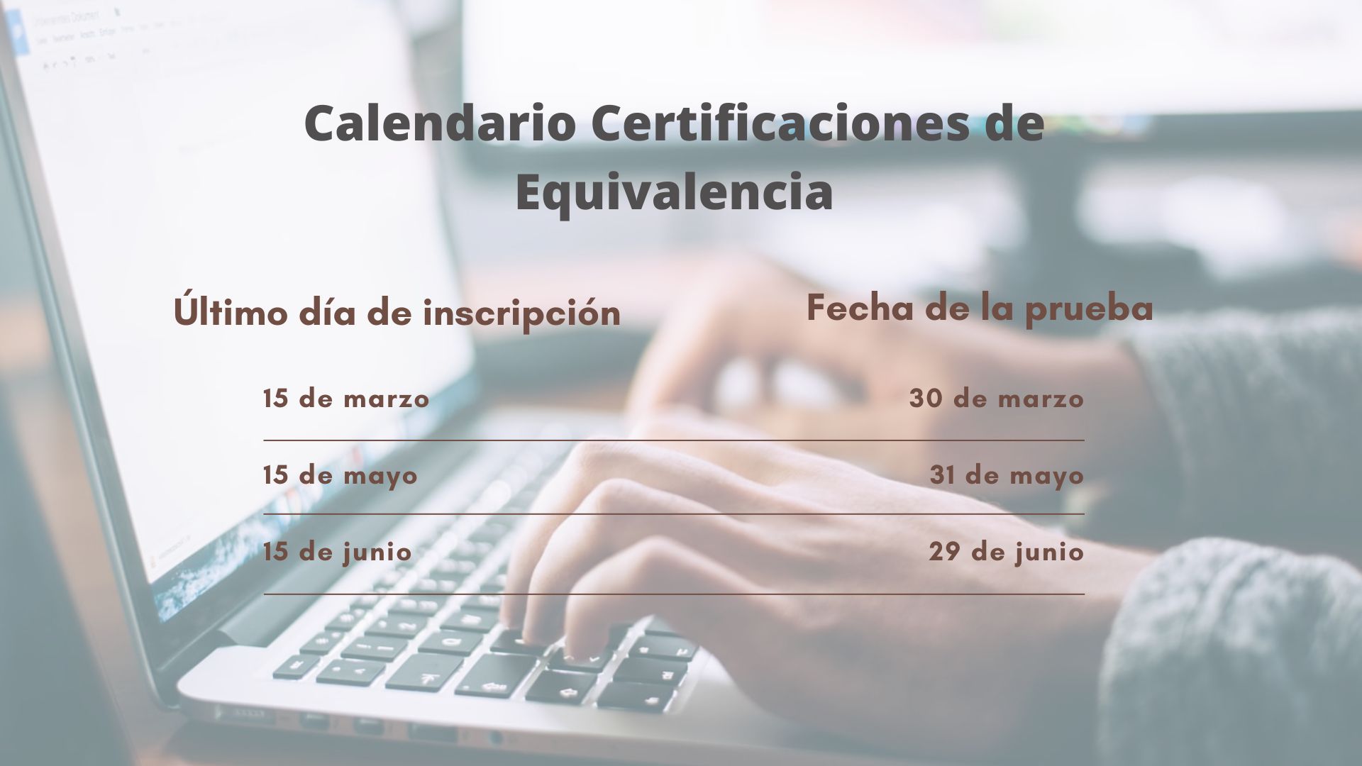 - Está abierta permanentemente la inscripción a estas Pruebas-Examen. Todas las inscripciones que se realicen hasta el 15 de mayo se gestionarán para el examen del día 31. Las inscripciones posteriores se incorporan ya al examen siguiente, previsto para el 29 de junio.